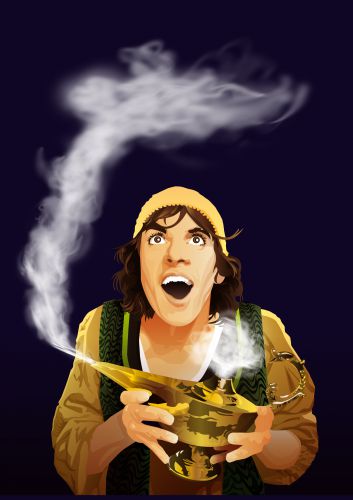 Eines Tages trifft er den finsteren Zauberer Dschafar, der ihn beauftragt, eine besondere Öllampe aus einer Höhle zu holen. Weil ihn der Zauberer in der Höhle zurücklassen will, behält Aladdin die Lampe für sich und entdeckt bald ihr Geheimnis: einen Lampengeist, der seinem Besitzer drei Wünsche erfüllen muss. Er schließt Freundschaft mit Dschinn, dem Geist der Lampe, und verspricht, ihm mit dem letzten Wunsch die Freiheit zu schenken.