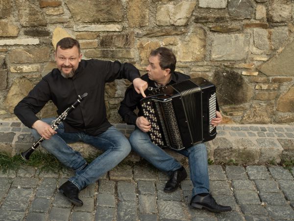 Musikalisch untermalt von den schwungvollen Klängen des Duos „klezmer reloaded“ schlüpfen Michael Maertens und Daniel Keberle in die Rollen von Friedrich Torberg und Ephraim Kishon.