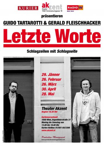 Jeden letzten Dienstag im Monat blicken die Kabarettisten GuidoTartarotti und Gerald Fleischhacker gemeinsam auf die Skurrilitäten und Ereignisse des vergangenen Monats zurück. Das Theater Akzent wird zum Hort satirischer Analysen, skurrilen Humors und nicht immer politisch korrekter Ansichten über die Unzulänglichkeiten unseres Alltags. Egal ob aus Gesellschaft, Kultur, Sport oder Politik - die beiden ironischen Beobachter Tartarotti & Fleischhacker versuchen an diesem Abend gemeinsam mit dem Publikum ein wenig gescheiter zu werden und Dinge zu verstehen die auf den ersten Blick einfach nicht logisch erscheinen mögen. Warum sind die Kärntner so wie sie sind zum Beispiel, warum muss man fürs Rauchen noch kein Parkpickerl kaufen oder warum ist das Tier der bessere Mensch?